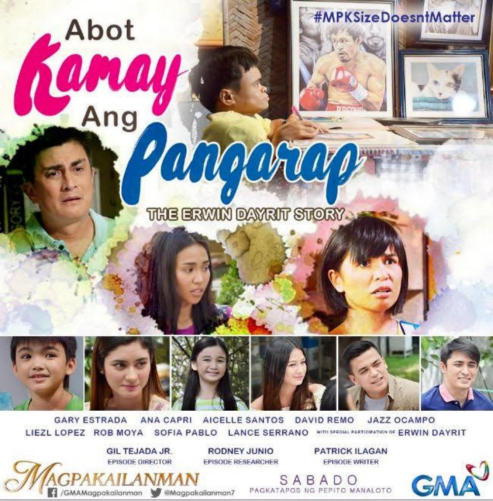 Ngayong Sabado, March 18, 2017, sama-sama nating tunghayan ang totoong kwento ng pakikipagsapalaran at pakikipaglaban sa kabila ng kapansanan, ”ABOT KAMAY ANG PANGARAP: THE ERWIN DAYRIT STORY.”