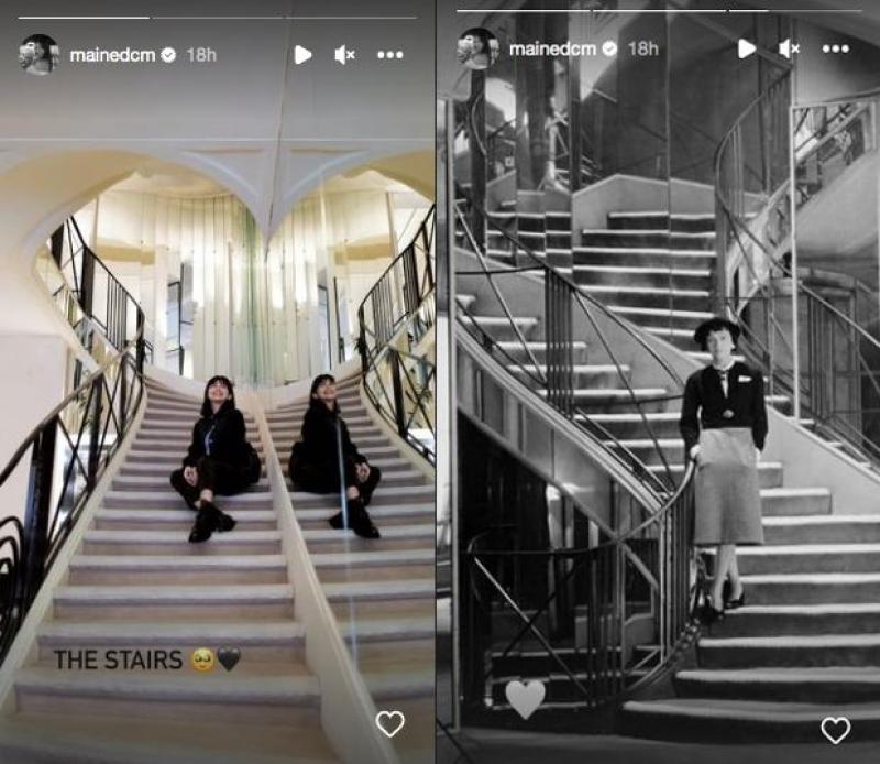 The first floor houses the Chanel boutique, while the stairway leads to Coco's apartment on the second floor. Maine had her photo taken at the same staircase.