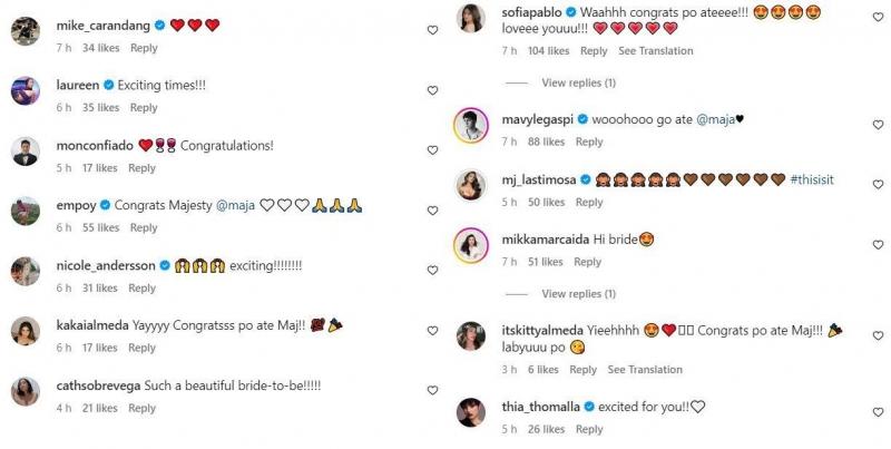 Meanwhile, in the comments section, fans and supporters of Maja including her fellow celebrities like MJ Lastimosa, Thia Thomalla, Laureen Uy, Mavy Legaspi, Sofia Pablo, and Mon Confiado, got wild and excited about her union with her fiancé Rambo Nuñez Ortega which will happen this month.