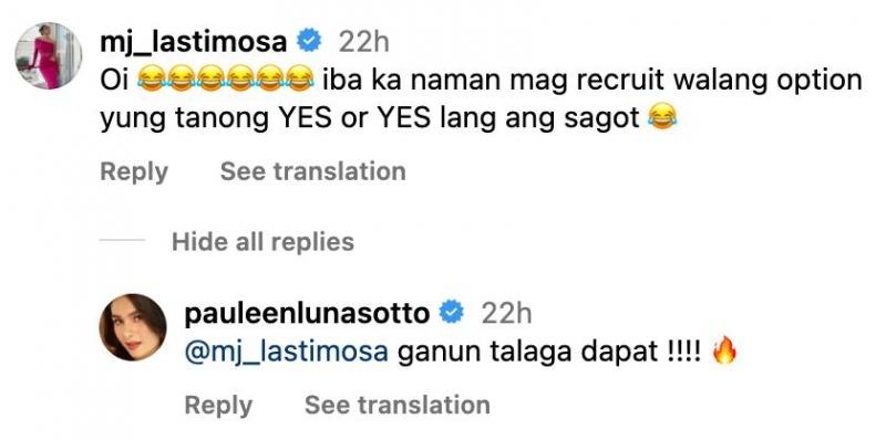 MJ jokingly replied to Pauleen's post with, “[I]ba ka naman mag recruit walang option yung tanong YES or YES lang ang sagot.”