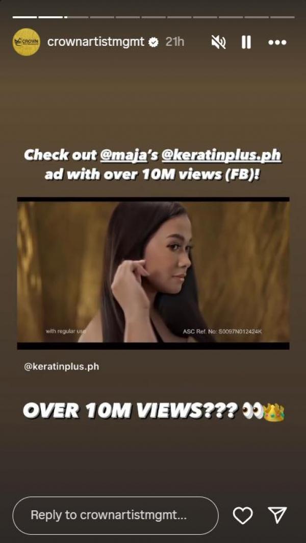 In a post on Instagram Story by Crown Artist Management (CAM), it stated that Maja's new ad has gotten millions of views on Facebook. CAM is the talent management agency founded by the actress where she also serves as the president and chief executive officer.