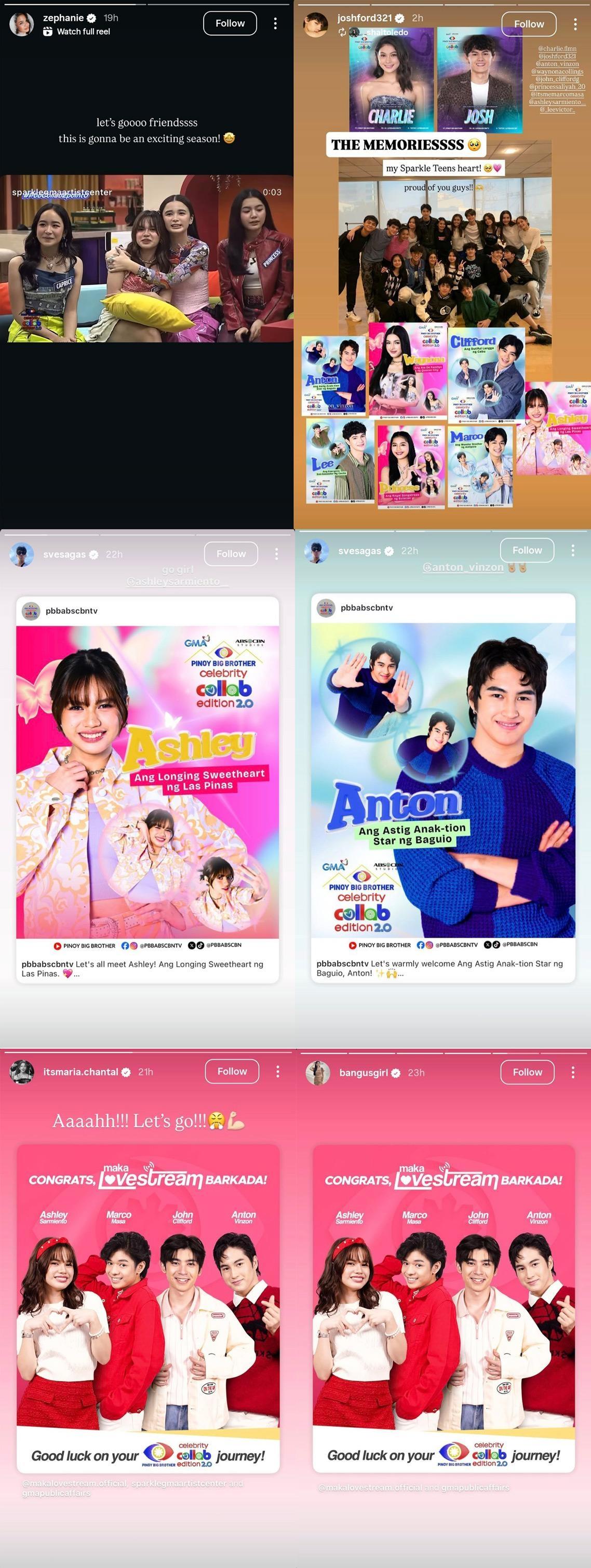 Sa kani-kanilang Instagram stories, ipinarating nina Zephanie, Shan Vesagas, Chanty, Josh Ford, at May Ann Basa ang kanilang suporta at excitement para sa PBB journey nina Ashley, Marco, Clifford, at Anton.