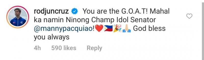 “You are the G.O.A.T! Mahal ka namin Ninong Champ Idol Senator @mannypacquiao! God bless you always,” wrote Kapuso star Rodjun Cruz.