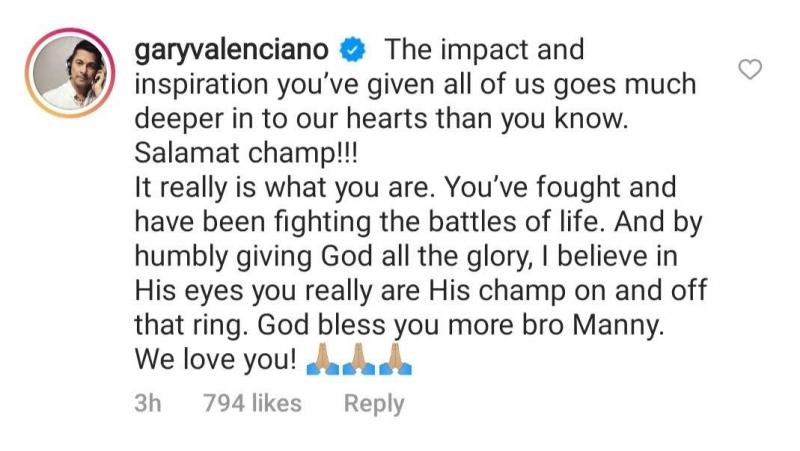 On the other hand, local musician and celebrity dad Gary Valenciano penned a lengthy message for the Pambansang Kamao.