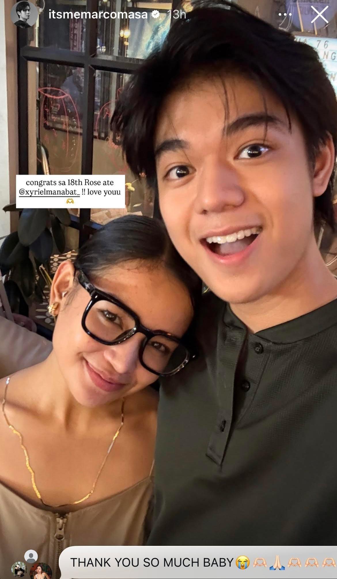 Marco shared a photo of himself with Xyriel on Instagram Stories, as he congratulated the Star Magic artist on her latest film, 18th Rose, where she takes on a leading role.