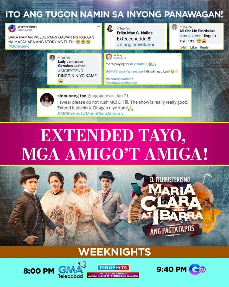 Narinig naman ng GMA Entertainment Group at ng produksiyon ng serye ang hiling ng mga manonood. Extended na ang Maria Clara at Ibarra.