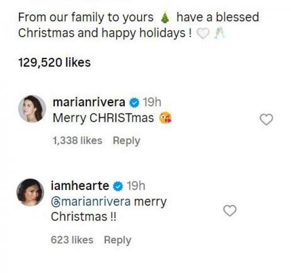 Kapuso Primetime Queen Marian Rivera and international fashion icon Heart Evangelista exchanged holiday greetings on Instagram on Christmas Day, December 25.