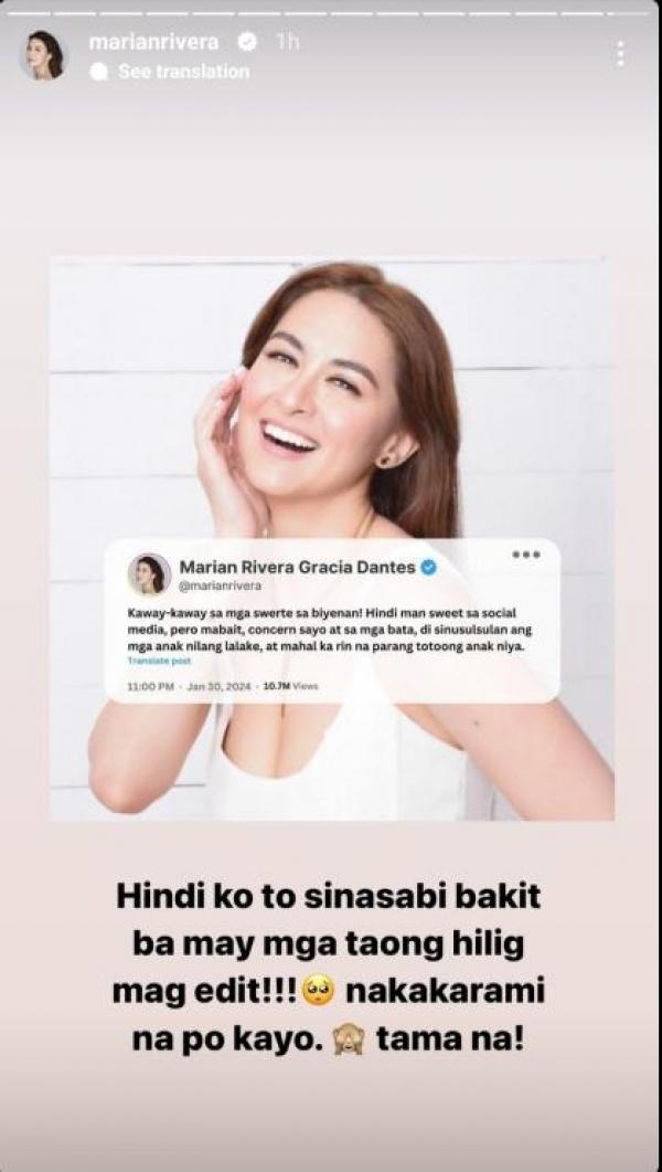 "Hindi ko 'to sinasabi. Bakit ba may taong hilig mag-edit!!! Nakakarami na po kayo. Tama na!" pakiusap ni Marian.