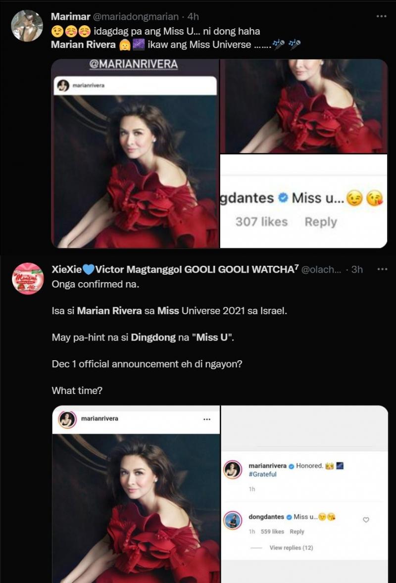 Celebrity reactions to her post are not helping tamp down the speculations. Her husband and Kapuso Primetime King Dingdong Dantes is only fueling speculations with the seemingly innocuous comment “Miss u...” with a wink emoji added.