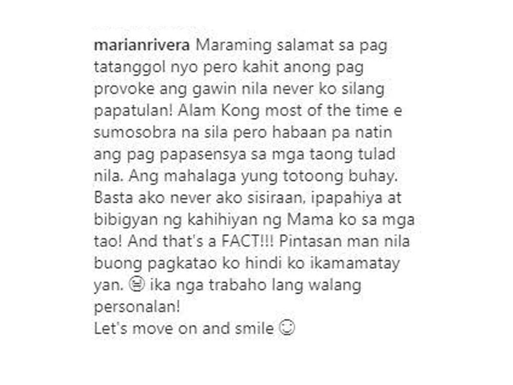 Ayon kay Marian, “Maraming salamat sa pagtatanggol n'yo pero kahit ano'ng pag-provoke ang gawin nila never ko silang papatulan!