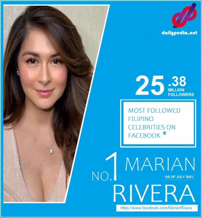 Nangunguna pa rin si Primetime Queen Marian Rivera bilang "Most Followed Filipino Celebrity" sa Facebook, ayon sa report ng dailypedia.net.