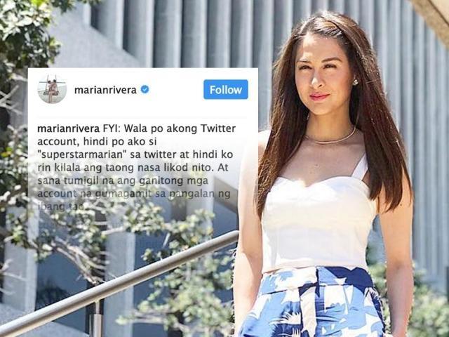 FYI: Wala po akong Twitter account, hindi po ako si "superstarmarian" sa twitter at hindi ko rin kilala ang taong nasa likod nito. At sana tumigil na ang ganitong mga account na gumagamit sa pangalan ng ibang tao.