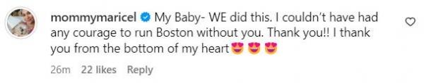 In the comment section, Maricel replied, "My Baby- WE did this. I couldn't have had any courage to run Boston without you. Thank you!! I thank you from the bottom of my heart."