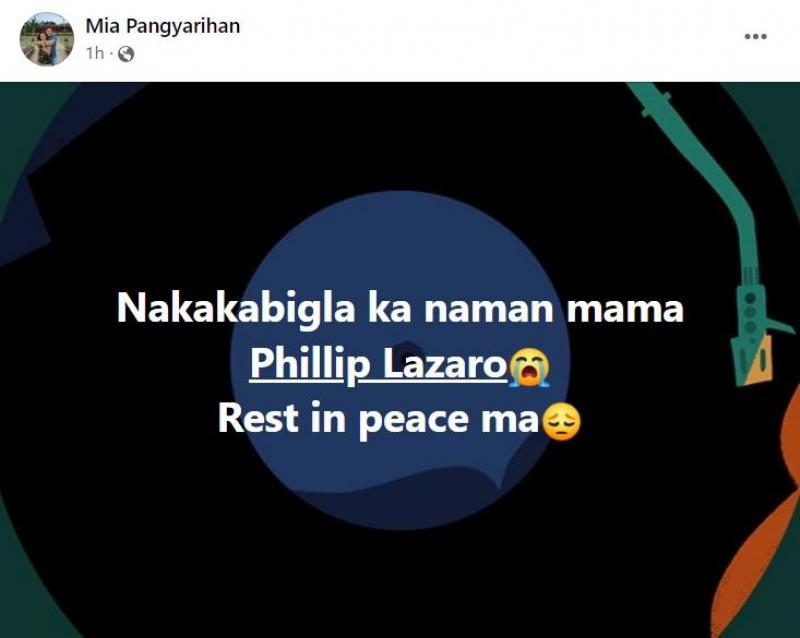 Aniya, "Nakakabigla ka naman mama Phillip Lazaro. Rest in peace ma."