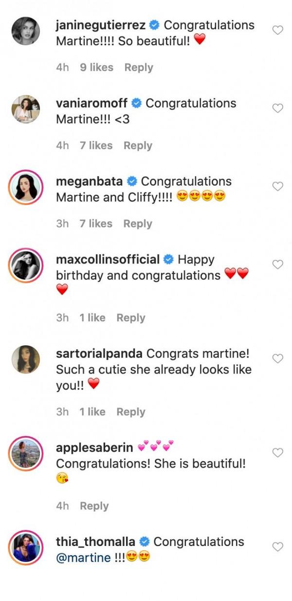 Celebrities and friends from the industry congratulated the new mom including Kapuso actresses Janine Gutierrez, Megan Young, Max Collins, and Thia Thomalla.