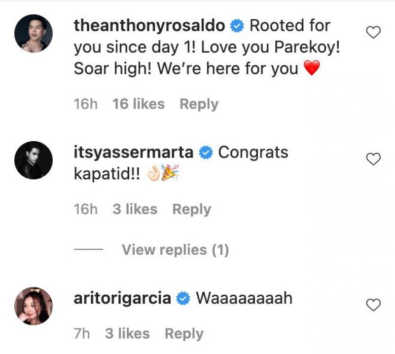 Kapuso Pop Rocker Anthony Rosaldo wrote, “Rooted for you since day 1! Love you, Parekoy! Soar high! We're here for you.”