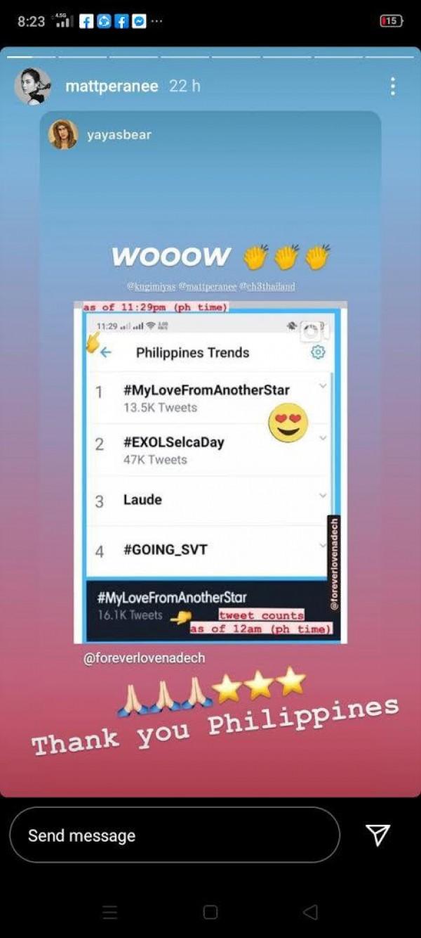 Thai actress Matt Peranee felt the love from Filipino fans as the #MyLoveFromAnotherStar dominated the top trending list in Philippine Twitter.