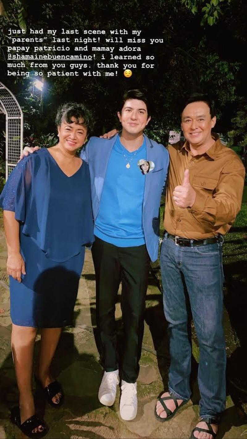 He wrote, "Just had my last scene with my 'parents' last night! Will miss you papay patricio and mamay adora @shamainebuencamino!"