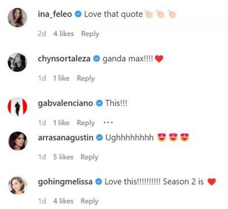 Both posts have gotten reactions from her Instagram followers as well as her fellow celebrities. For instance, Ina Feleo, Chynna Ortaleza, and Gab Valenciano were all cheering her on in the first post, while Arra San Agustin and Melissa Gohing were expressing their admiration in the second one.