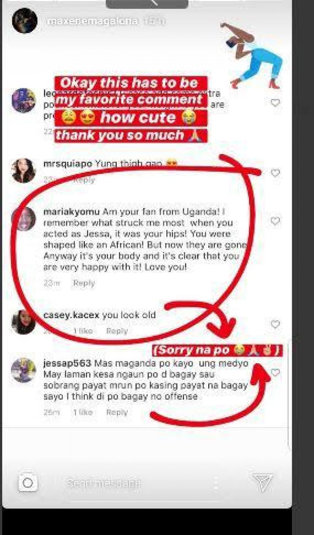 Sa Instagram Story ni Maxene, makikita ang reaksiyon niya mga taong pumuna sa kanyang hitsura ngayon.