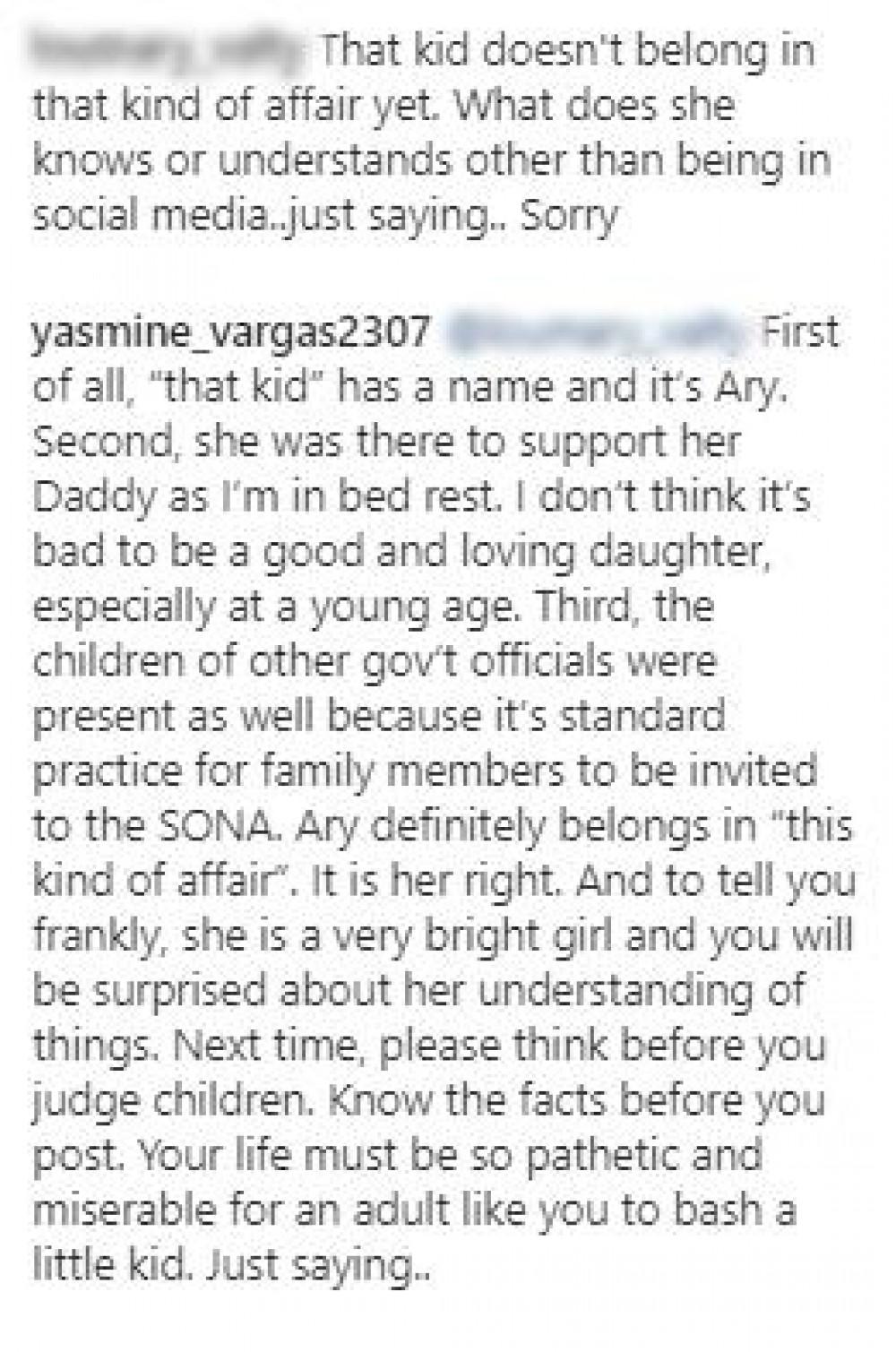 Sagot niya, "First of all, “that kid” has a name and it’s Ary. Second, she was there to support her Daddy as I’m in bed rest. I don’t think it’s bad to be a good and loving daughter, especially at a young age. Third, the children of other gov’t officials were present as well because it’s standard practice for family members to be invited to the SONA.