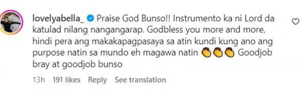 Sabi ng former Bubble Gang comedienne, “Praise God Bunso!! Instrumento ka ni Lord da katulad nilang nangangarap. Godbless you more and more, hindi pera ang makakapagpasaya sa atin kundi kung ano ang purpose natin sa mundo eh magawa natin Goodjob bray at goodjob bunso”