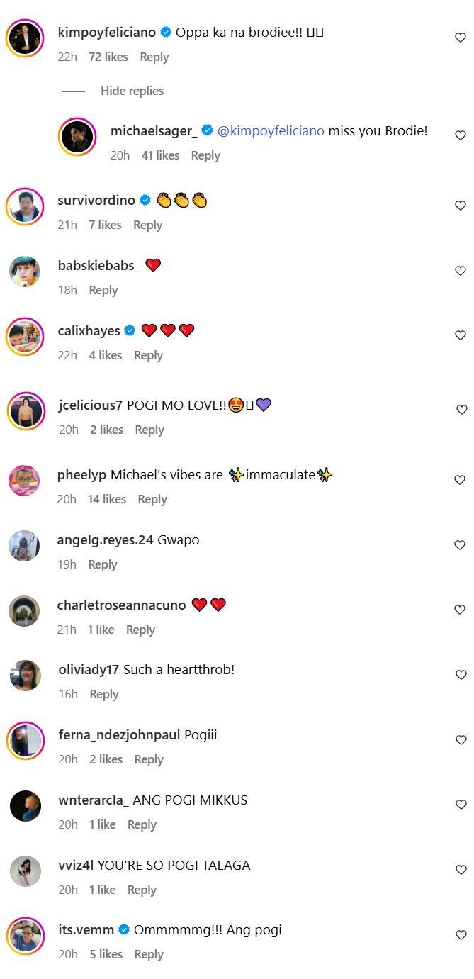 Even his former co-star in Tahanang Pinakamasaya Kimpoy Feliciano left a comment on his carousel of photos describing him as an 'oppa.' Others couldn't help gushing over Michael's pogi shots.