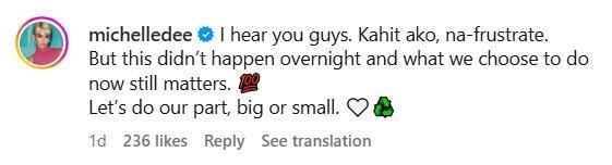 Nag-react dito si Michelle at hinikayat ang kanyang followeres na gawin ang lahat ng makakaya, maliit man o malaki, para pangalagaan ang kalikasan.