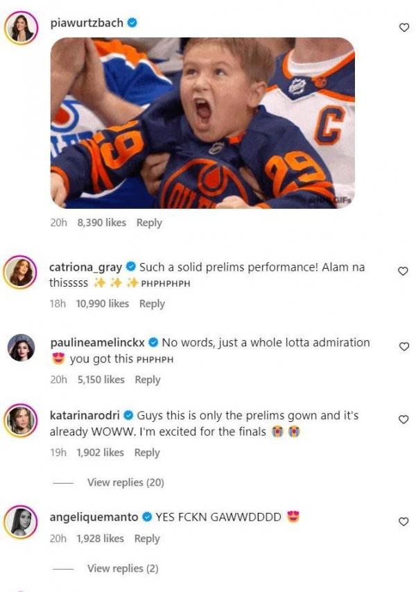 On Michelle's Instagram, both Pia and Catriona reacted to her prelims performance.