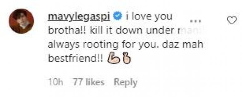 Mensahe naman ni Mavy, "I love you brotha!! kill it down under man!! always rooting for you. daz mah bestfriend!! 💪🏻🤞🏻"