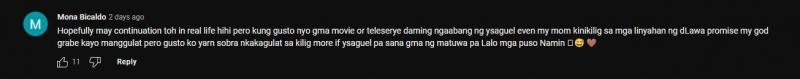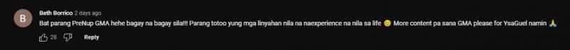 "Ba't parang PreNup GMA hehe bagay na bagay sila!!! Parang totoo 'yung mga linyahan nila na na-experience na nila sa life," a certain Beth Borrico commented on YouTube.