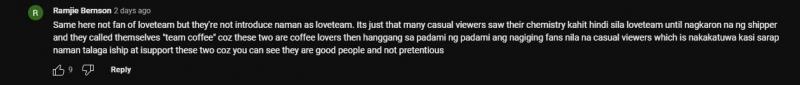 A part of the comment read, "They're not introduced naman as loveteam. It's just that many casual viewers saw their chemistry kahit hindi sila loveteam until nagkaroon na ng shipper and they called themselves "team coffee" coz these two are coffee lovers then hanggang sa padami nang padami ang nagiging fans nila na casual viewers which is nakakatuwa kasi sarap naman talaga i-ship at i-support these two coz you can see they are good people and not pretentious."