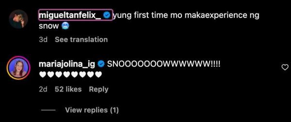 Celebrity mom Jolina Magdangal also understood Miguel's delight with the snow and commented on the Kapuso star's Instagram post.