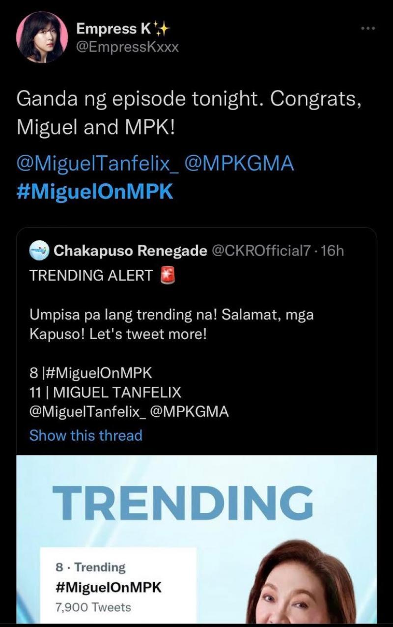 Dahil sa galing na ipinakita ni Miguel, mabilis na naging hot topic online ang kanyang naging acting performance. Umakyat pa sa Twitter Philippines top trending list ang #MiguelOnMPK at Miguel Tanfelix.