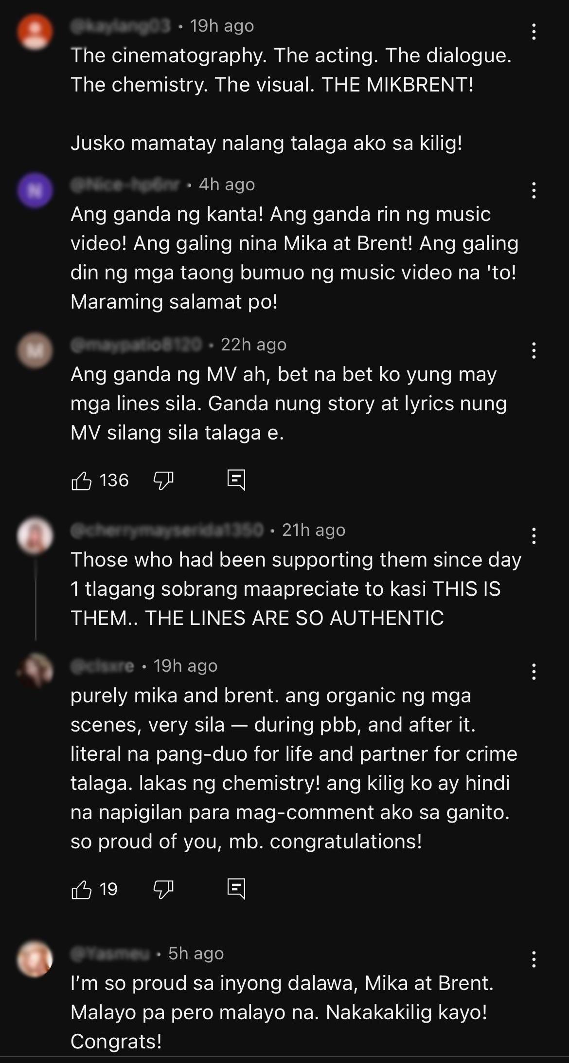 Sa comments section, labis ang kilig na nararamdaman ng netizens dahil sa ganda ng awitin at music video, at sa magandang chemistry nina Mika at Brent.
