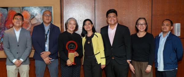 Presenting the award to Mrs. Enriquez were 2022 PMAP President and Board of Trustee for Media and Communications member Ellen Fullido; PMAP Communication Specialist and Makatao Awards for Media Excellence Program Lead Martin Alcantara; Training Head Richard Mamuyac, and HR Head Bernadette Tan.