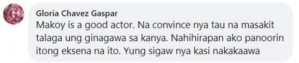 “Makoy is a good actor. Na-convince niya tayo na masakit talaga 'yung ginagawa sa kaniya. Nahihirapan ako panoorin itong eksena na ito. 'Yung sigaw niya kasi nakakaawa,” dagdag pa ng isang viewer.