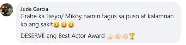 “Grabe ka Tasyo/ Mikoy namin tagos sa puso at kalamnan ko ang sakit. DESERVE ang Best Actor Award,” mensahe pa ng isang fan.