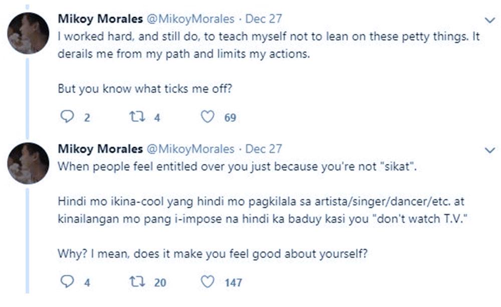 Dagdag pa niya, "But you know what ticks me off? When people feel entitled over you just because you're not "sikat". Hindi mo ikina-cool yang hindi mo pagkilala sa artista/singer/dancer/etc. at kinailangan mo pang i-impose na hindi ka baduy kasi you "don't watch T.V."