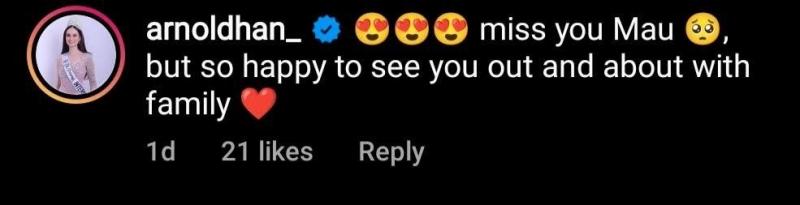 In the comments section, Binibining Pilipinas International 2021 Hannah Arnold expressed her happiness for her fellow beauty queen through the words, “Miss you Mau, but so happy to see you out and about with the family.”