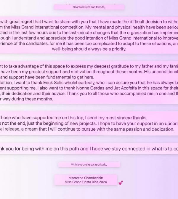 Meanwhile, Vietnamnet Global reports that Miss Grand Costa Rica Macarena Chamberlain has also withdrawn from the competition due to the changes in the pageant impacting her mental and physical health negatively. Macarena made the announcement on her Instagram account, which is now set to private.
