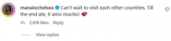 Chelsea replied to Tatiana's sweet post, “Can't wait to visit each other countries. Till the end ate, ti amo mucho!”