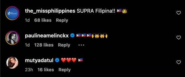 Former Miss Supranational Philippines Pauline Amelinckx and 2013 Miss Supranational Mutya Datul expressed their support for Alethea through emojis in the comments section of the post.