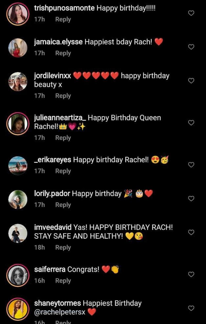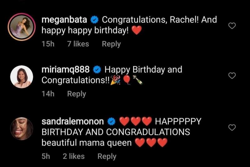 Pinay beauty queens such as Miss World 2013 Megan Young, Miss Universe 1999 first runner-up Miriam Quiambao, and Miss Universe Philippines 2020 candidate Sandra Lemonon congratulated Rachel on her new journey and sent their best birthday wishes in the comments section.