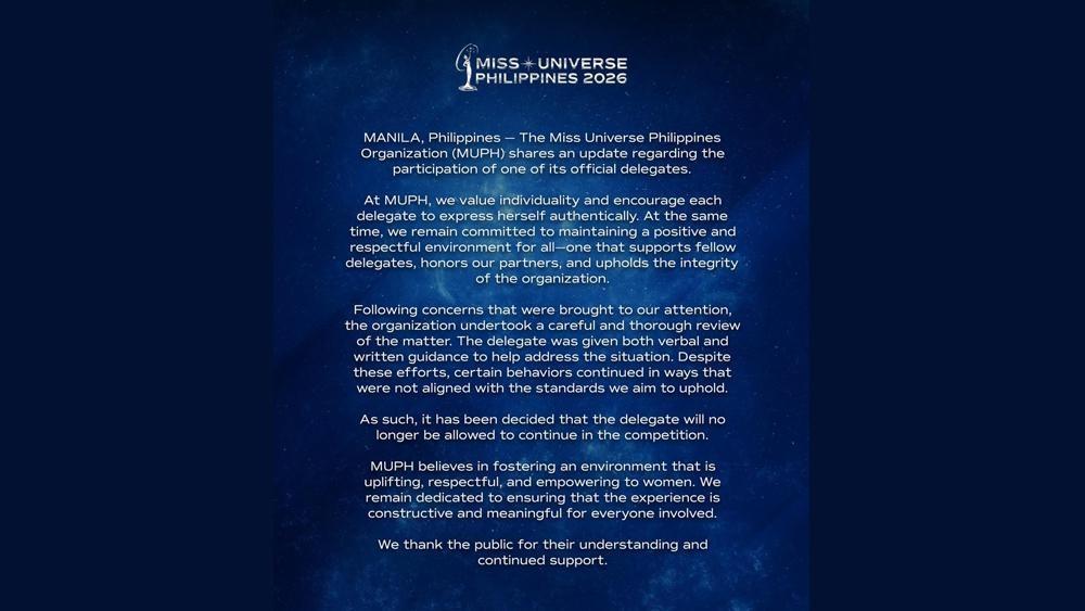 Sa statement na inilabas ng Miss Universe Philippines Organization sa social media, ipinaliwanag na ang desisyong ito ay dahil sa diumano'y pagpapatuloy ng naturang kandidata sa paggawa ng “certain behaviors.” Ito ay sa kabila ng verbal and written guidance na binigay ng organisasyon.