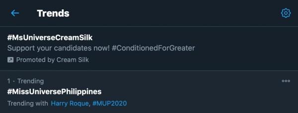 Presidential Spokesperson and Miss Universe Philippines judge Atty. Harry Roque and 'MUP2020' are also in the top 20 trending topics.