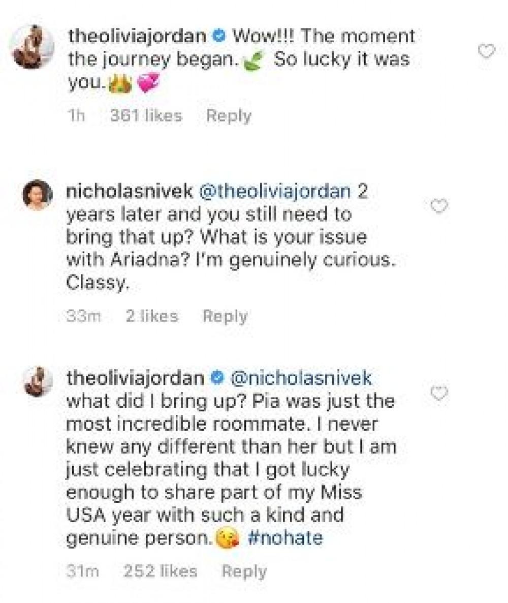 Her fellow contestant, Olivia Jordan, commented on the throwback photo of Pia, but her post didn’t go well for one netizen. Instagram user @nicholasnivek called out the American beauty queen for being insensitive to Ariadna Gutierrez.