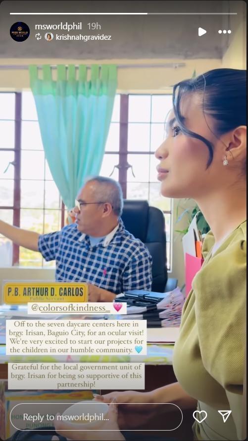 The Miss World Philippines official Instagram account had earlier posted an Instagram Story showing Krishnah meeting with an officer of the local government unit of Brgy. Irisan in Baguio City.