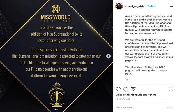 It read, “The Miss World Philippines (MWP) organization proudly announces its acquisition of the Miss Supranational title.
