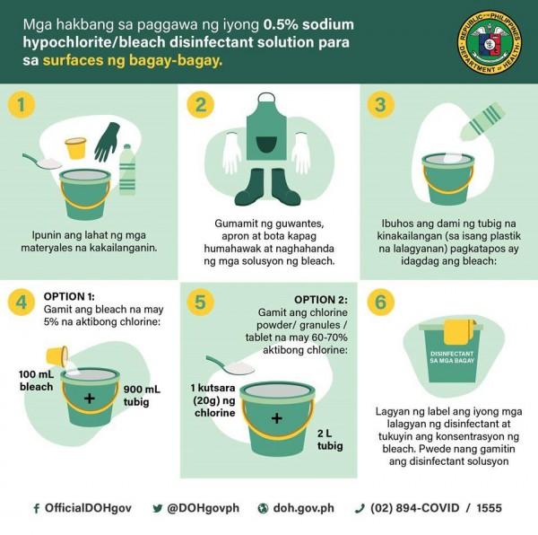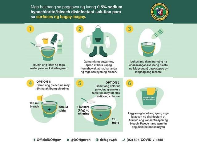 The DOH also reminds everyone who intends to make a disinfectant solution to always put a label on the bottle and keep it out of reach from children.